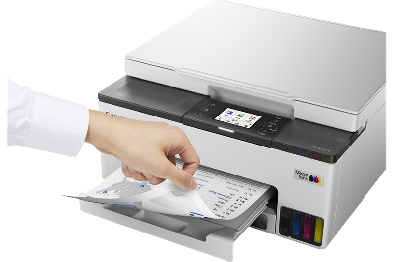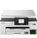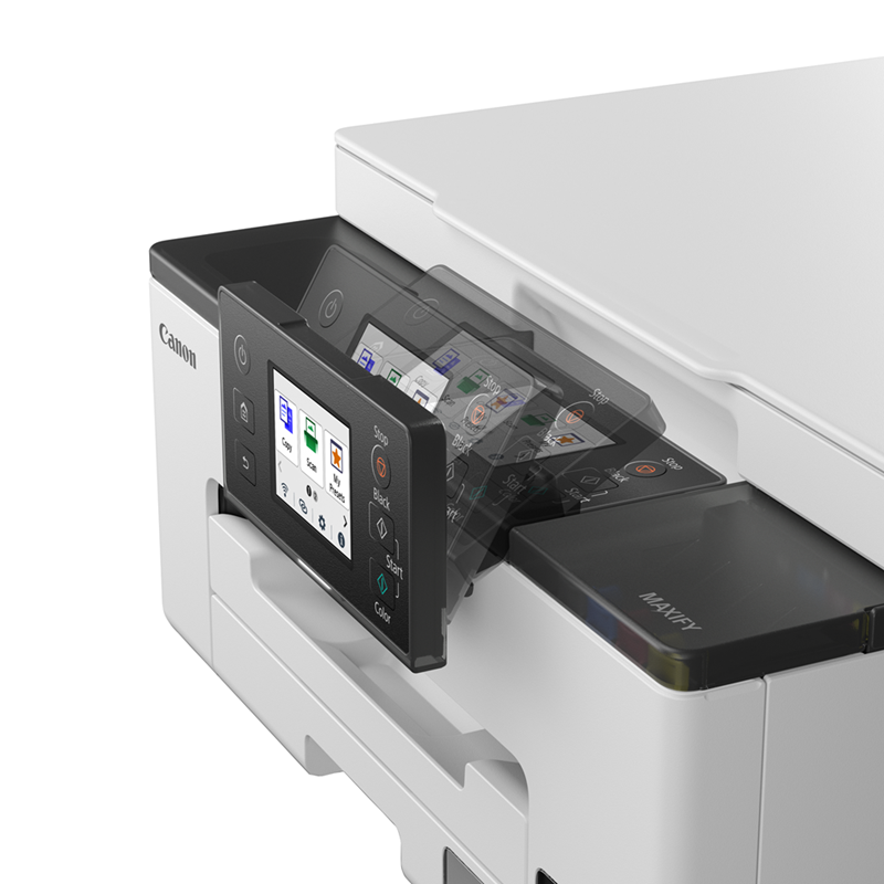 Canon Maxify GX1041 niewielka drukarka typu 3 w 1 ze zbiornikiem MegaTank zapewnia komfort pracy w biurze domowym. Szybko drukuj duże ilości dokumentów biznesowych w wysokiej jakości, korzystając z przystępnych cenowo butelek z atramentem.
